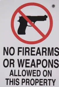 Laws regarding signage vary from state to state but in California “no guns allowed” signs do not carry the weight of law meaning there is no penalty for ignoring them. There are however some considerations of which to be aware.